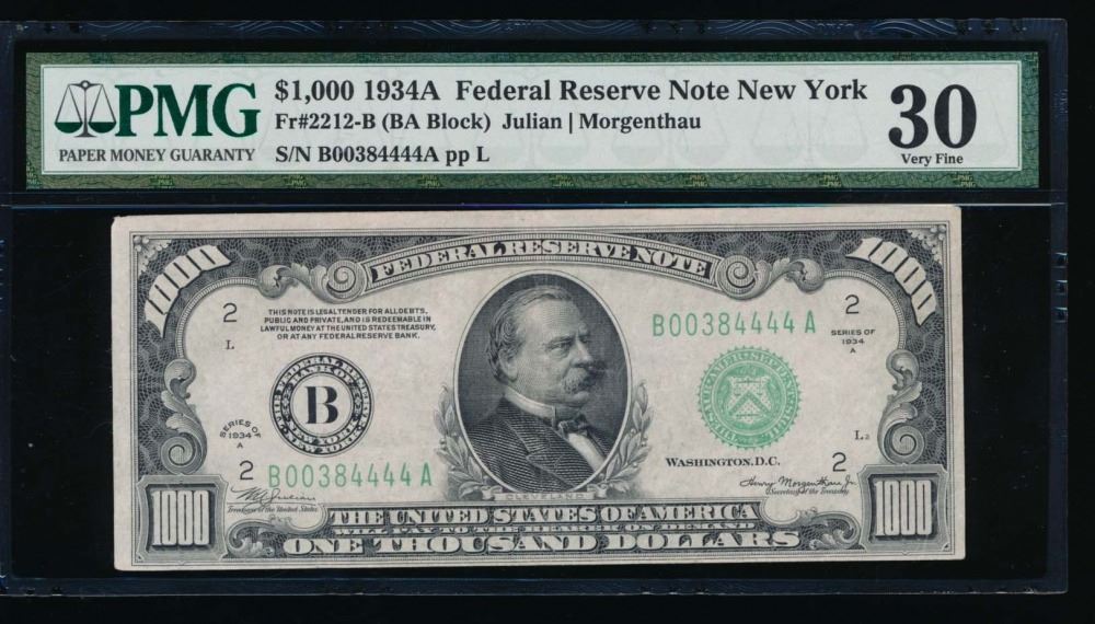One 1934A $1000 New York Federal Reserve Note PMG 30.