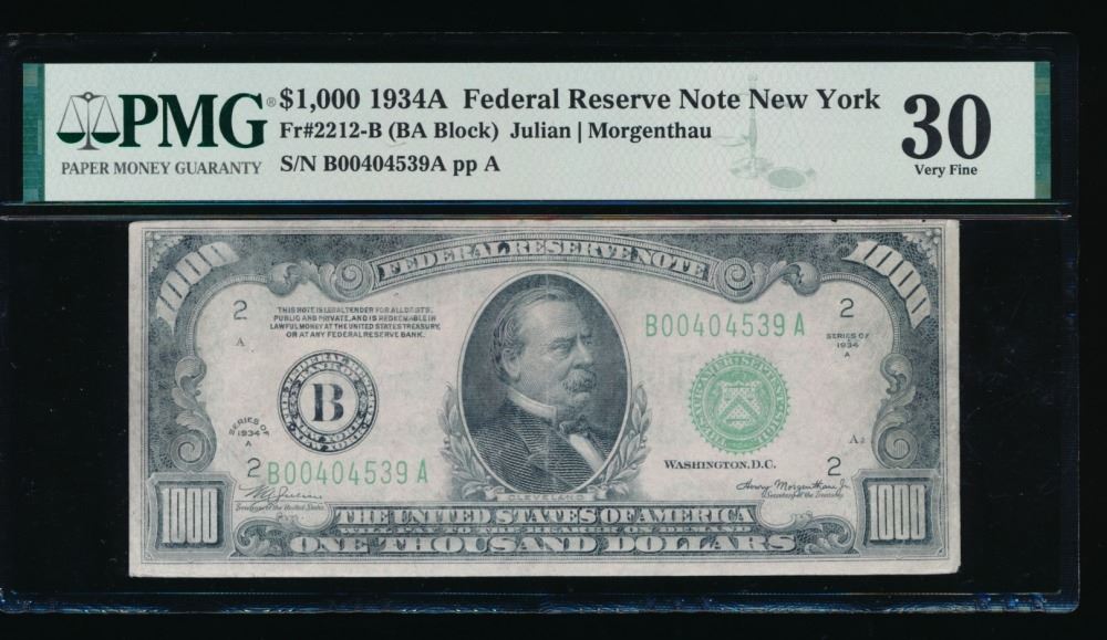 One 1934A $1000 New York Federal Reserve Note PMG 30.