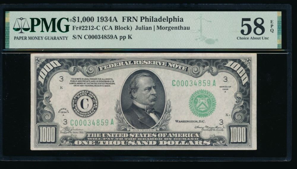 One 1934A $1000 Philadelphia FRN PMG 58EPQ.
