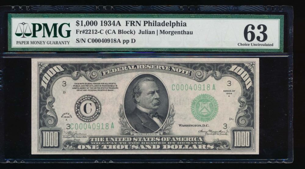 One 1934A $1000 Philadelphia Federal Reserve Note PMG 63.