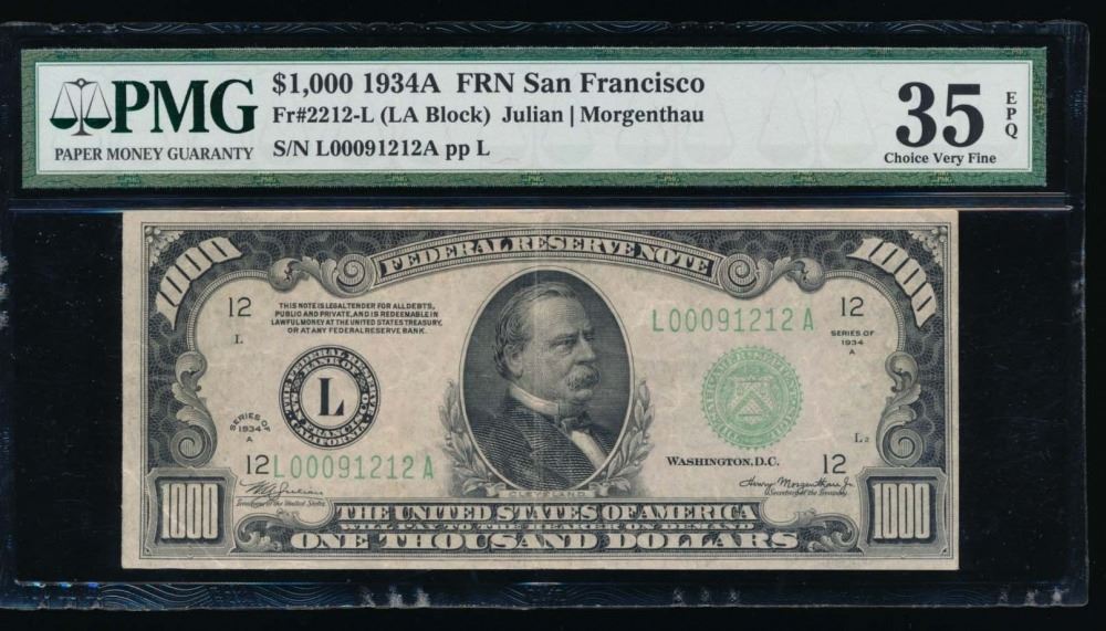 One 1934A $1000 San Francisco Federal Reserve Note PMG 35EPQ.