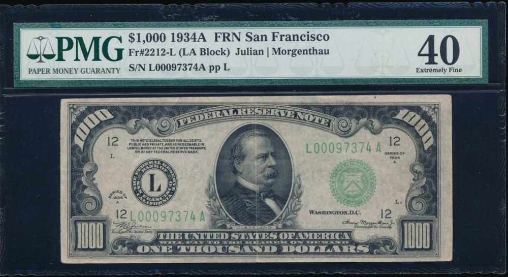 One 1934A $1000 San Francisco Federal Reserve Note PMG 40.