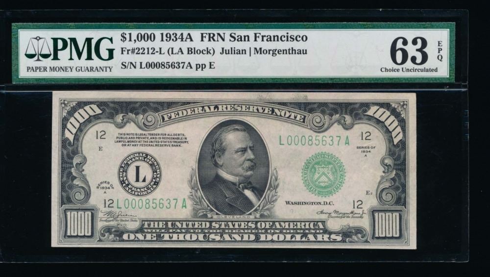 One 1934A $1000 San Francisco Federal Reserve Note PMG 63EPQ.