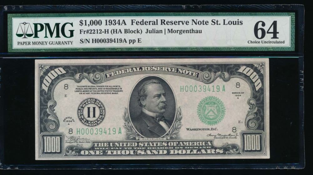 One 1934A $1000 St Louis Federal Reserve Note PMG 64.