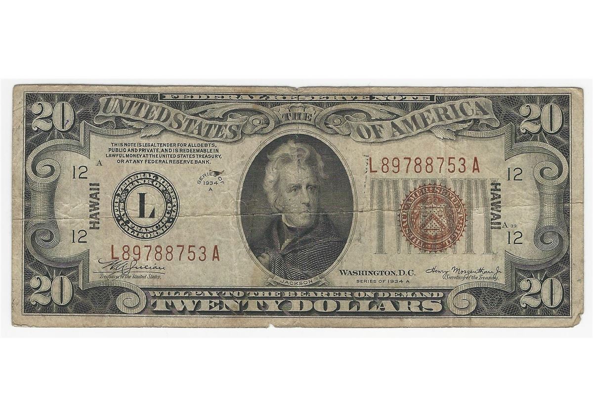 One 1934A $20 Federal Reserve Emergency Hawaii Note.