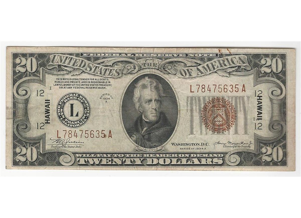 One 1934A $20 Federal Reserve Emergency Hawaii Note.