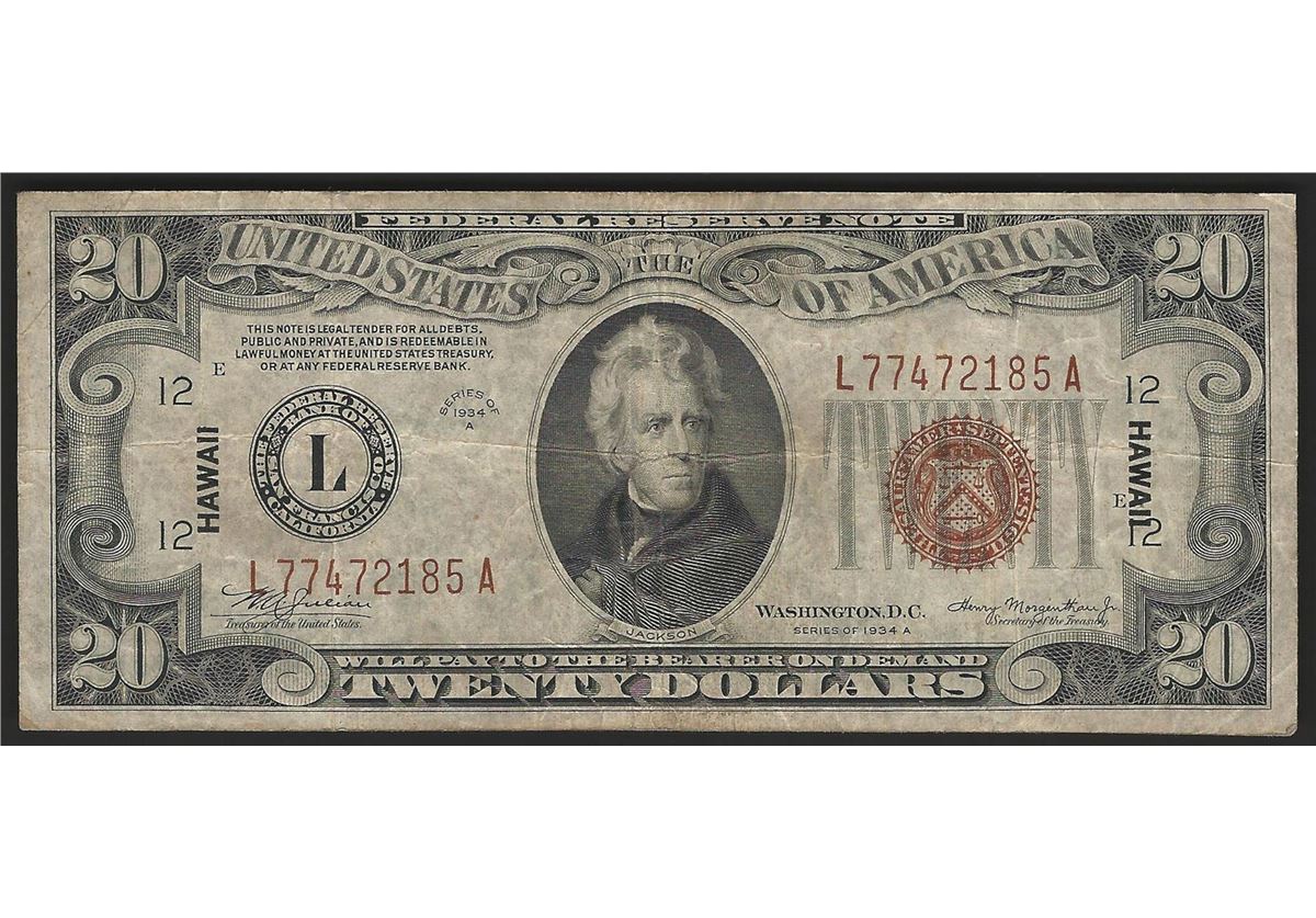 One 1934A $20 Federal Reserve Emergency Hawaii Note.