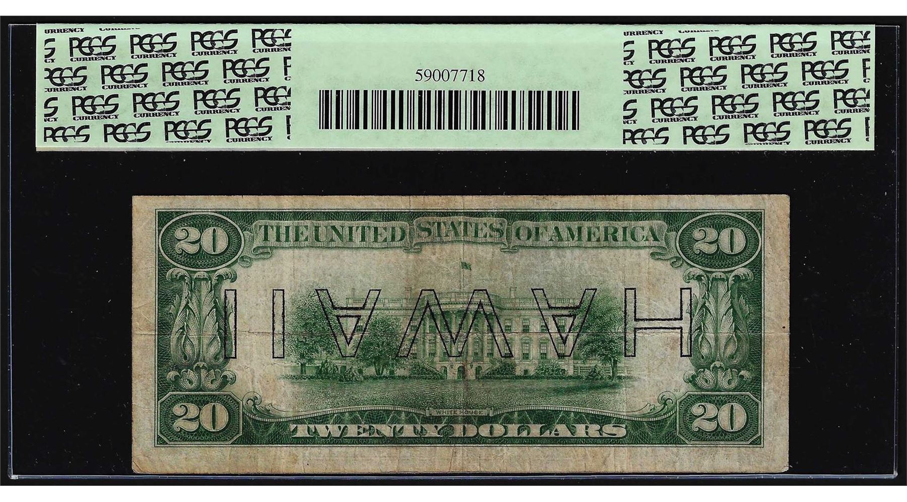One 1934A $20 Federal Reserve Emergency Note Inverted Hawaii Overprint ERROR PCGS F15 PPQ. PCGS Graded.