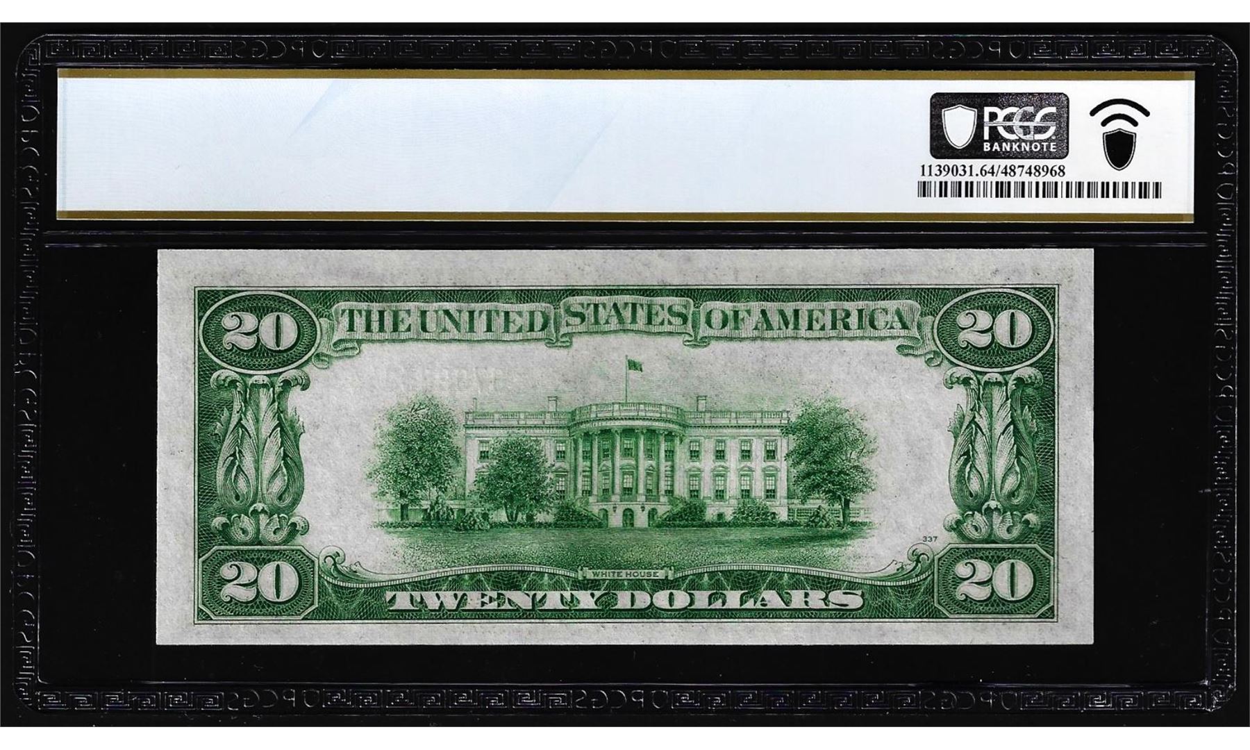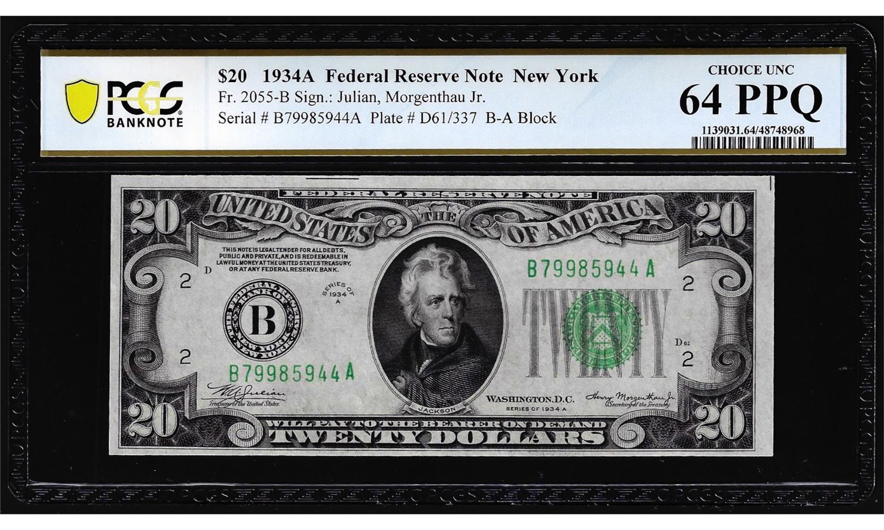 1934A $20 Federal Reserve Note New York Fr.2055-B PCGS Choice Uncirculated 64PPQ