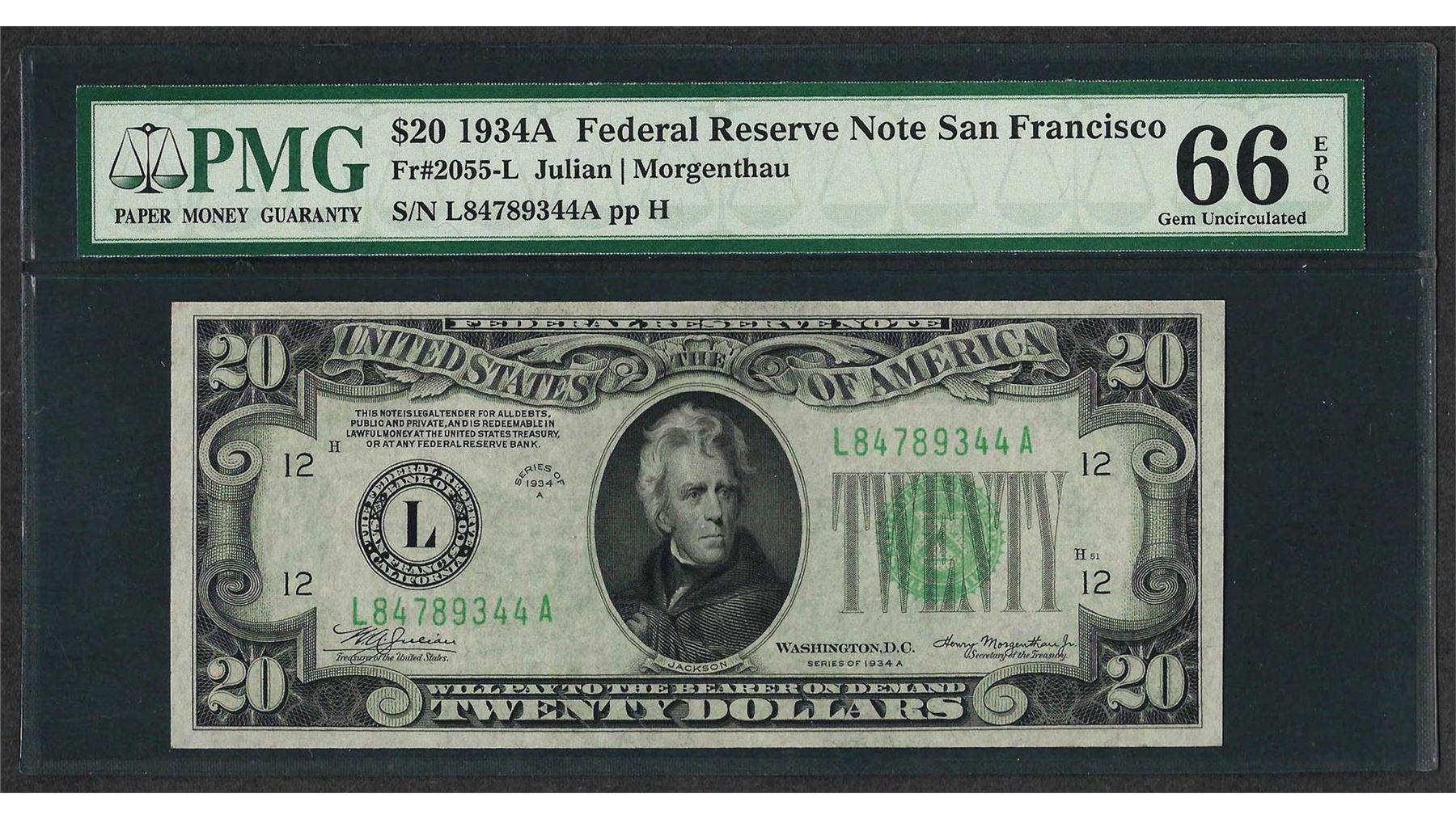 1934A $20 Federal Reserve Note San Francisco Fr.2055-L PMG Gem Uncirculated 66EP