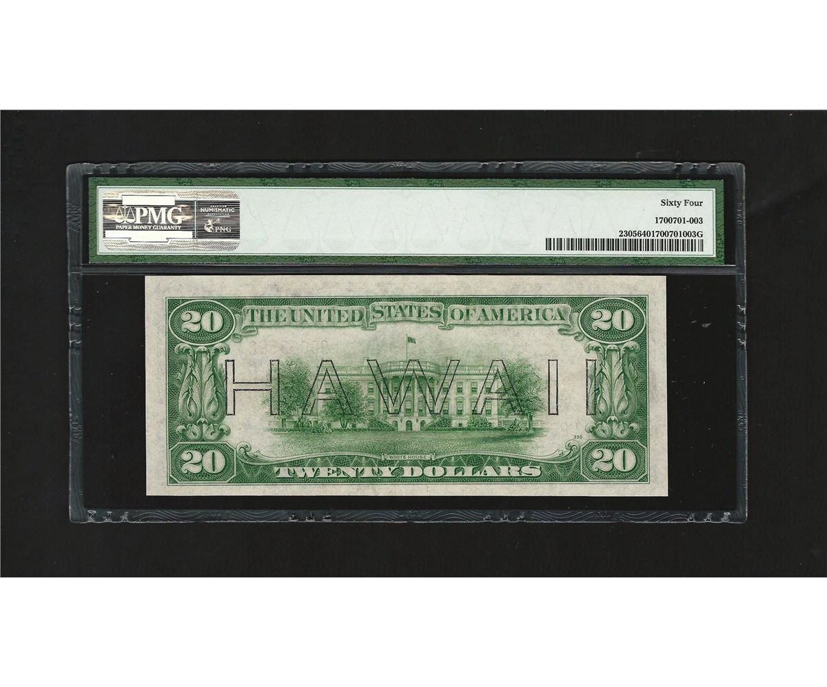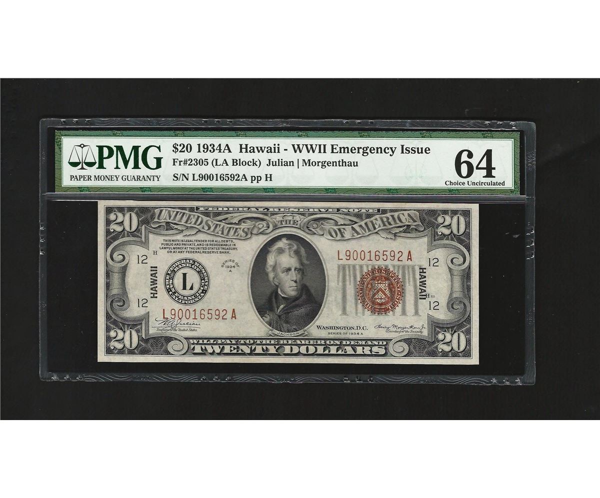 One 1934A $20 Federal Reserve WWII Emergency Hawaii Note PMG CU64. PMG Certified.