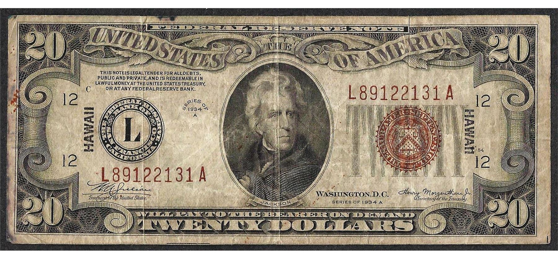 One 1934A $20 Federal Reserve WWII Emergency Hawaii Note.
