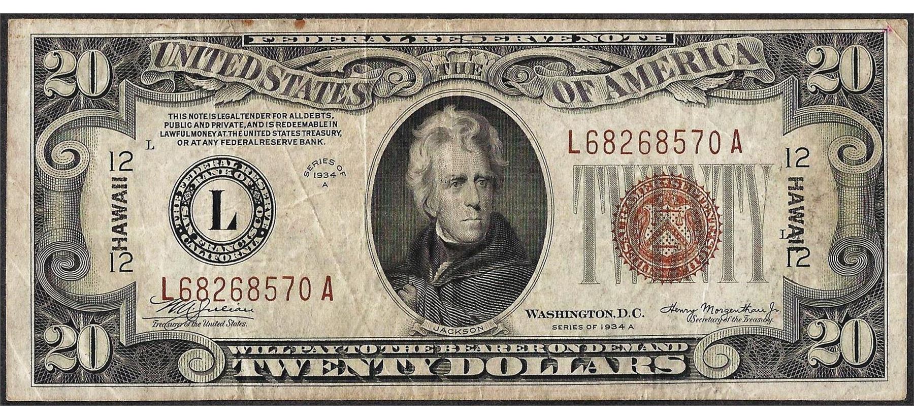 One 1934A $20 Federal Reserve WWII Emergency Hawaii Note.