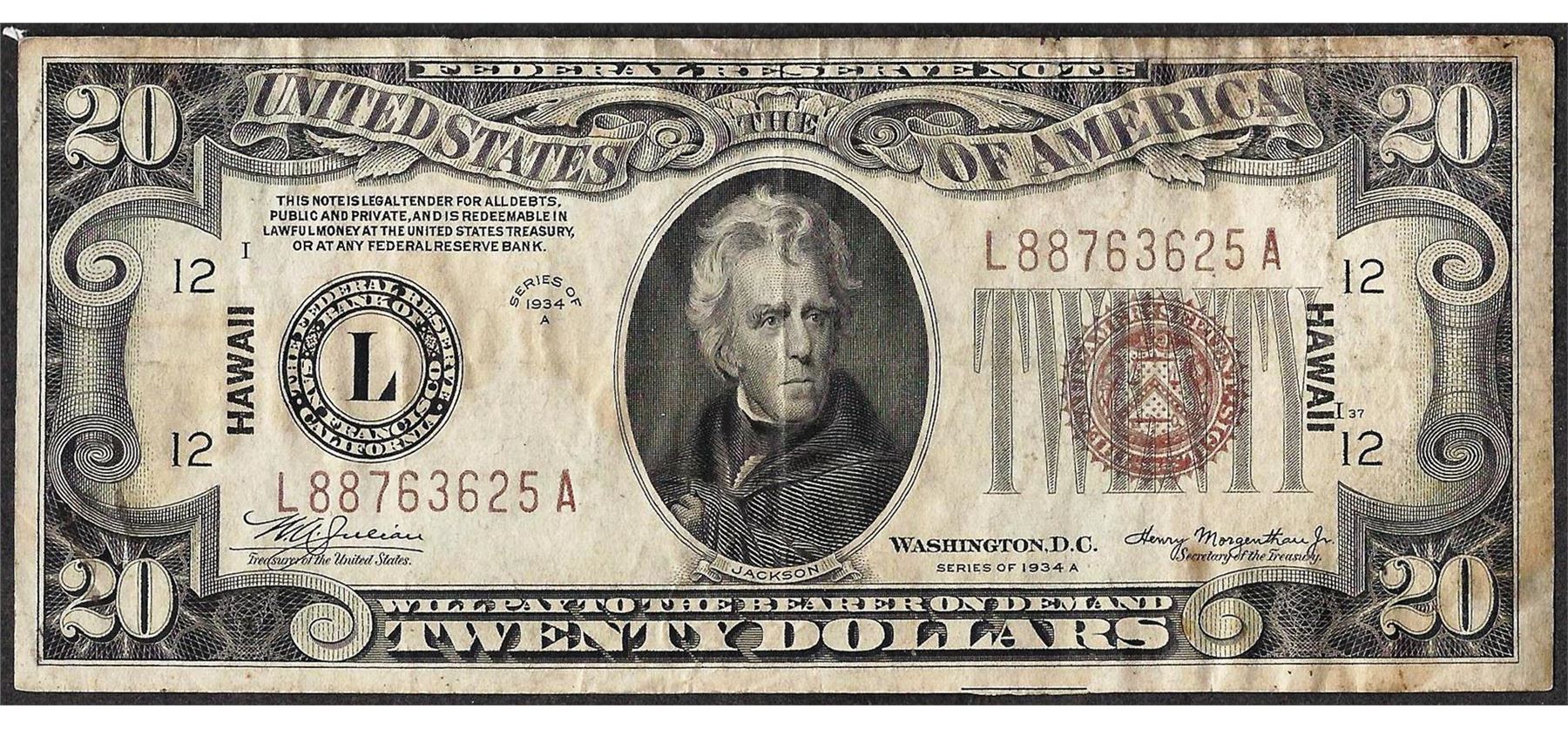 One 1934A $20 Federal Reserve WWII Emergency Hawaii Note.