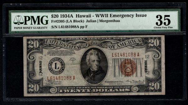 One 1934A $20 Hawaii Federal Reserve Note PMG 35.