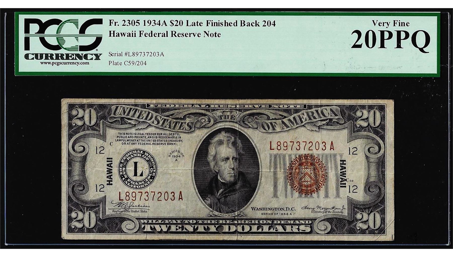 1934A $20 Hawaii Federal Reserve Note WWII Emergency Note PCGS Very Fine 20PPQ