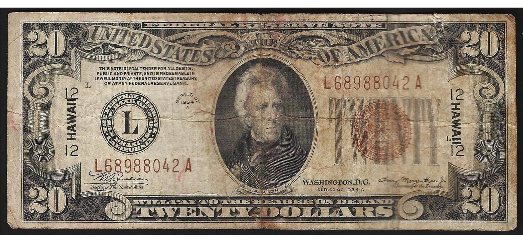 One 1934A $20 Hawaii Federal Reserve Note WWII Emergency Note.