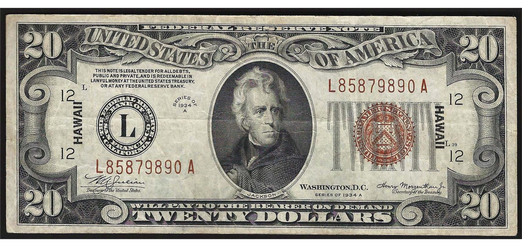 One 1934A $20 Hawaii Federal Reserve Note WWII Emergency Note.