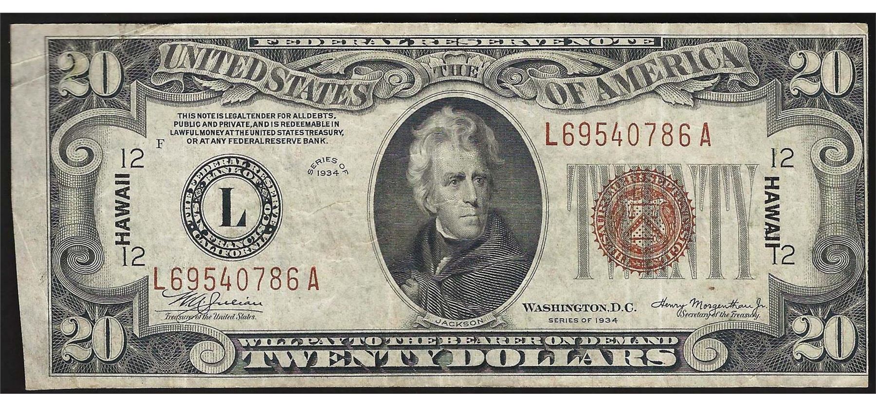 One 1934A $20 Hawaii Federal Reserve Note WWII Emergency Note.