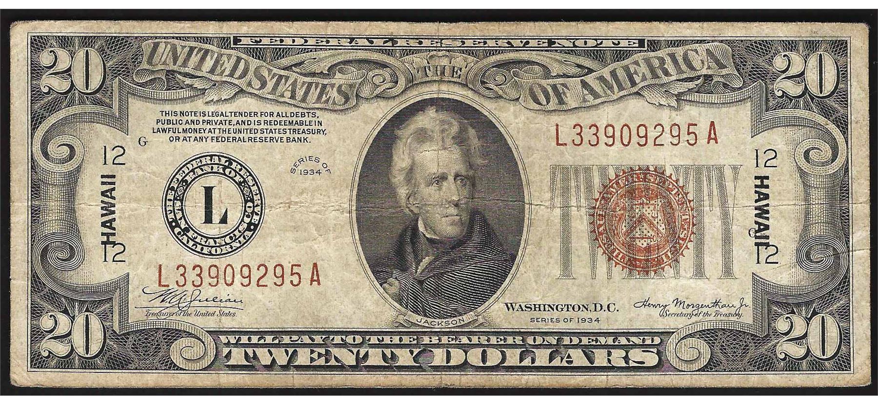 One 1934A $20 Hawaii Federal Reserve Note WWII Emergency Note.