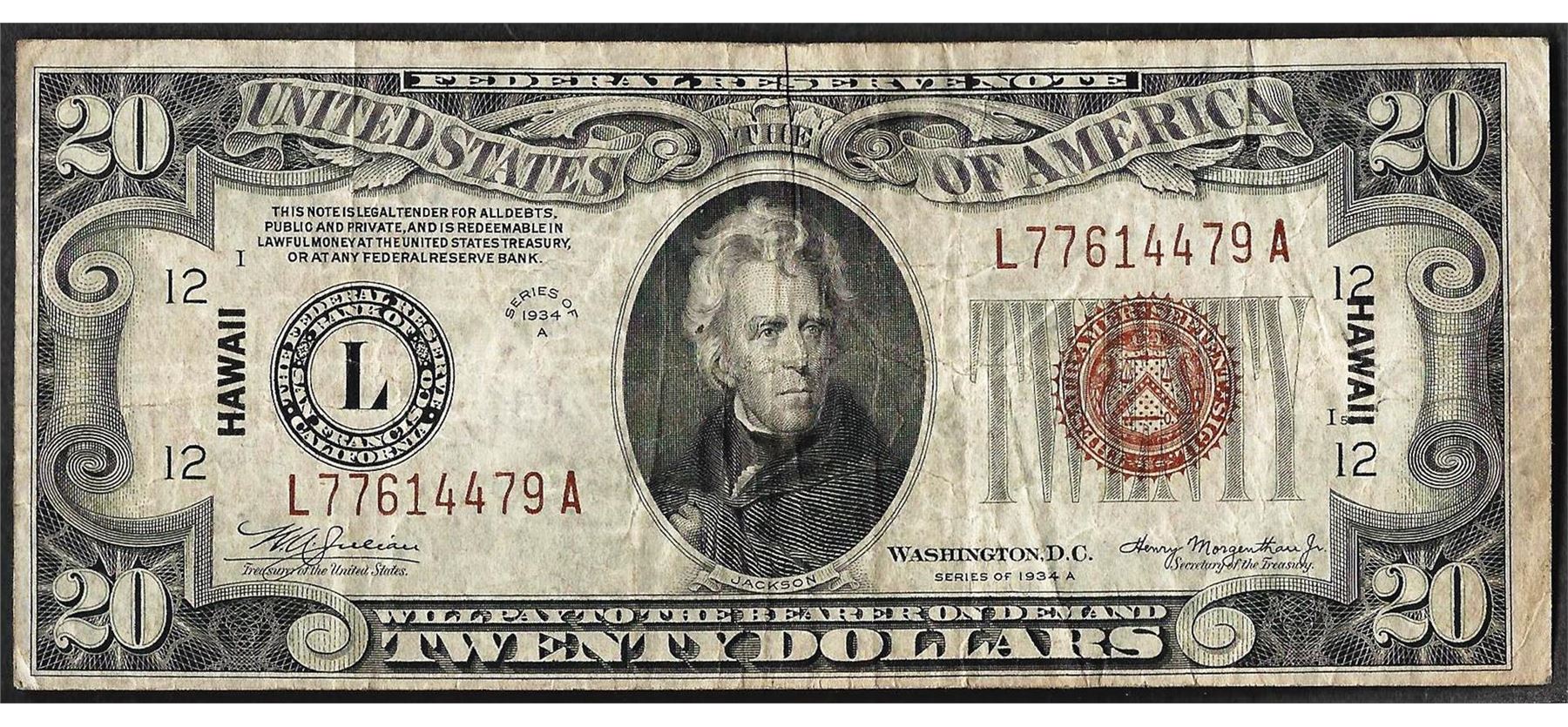 One 1934A $20 Hawaii Federal Reserve Note WWII Emergency Note.