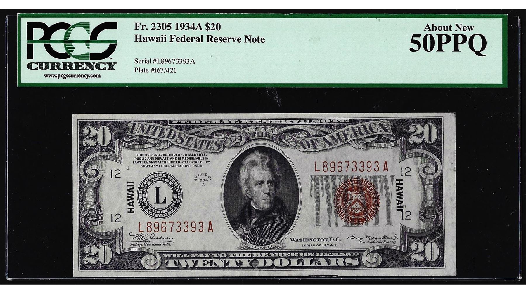 1934A $20 Hawaii Federal Reserve WWII Emergency Note Fr.2305 PCGS About New 50PPQ