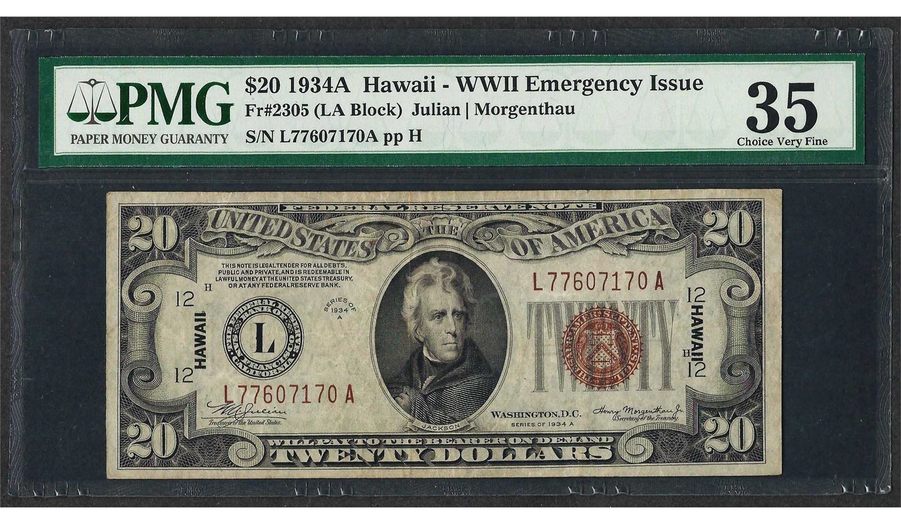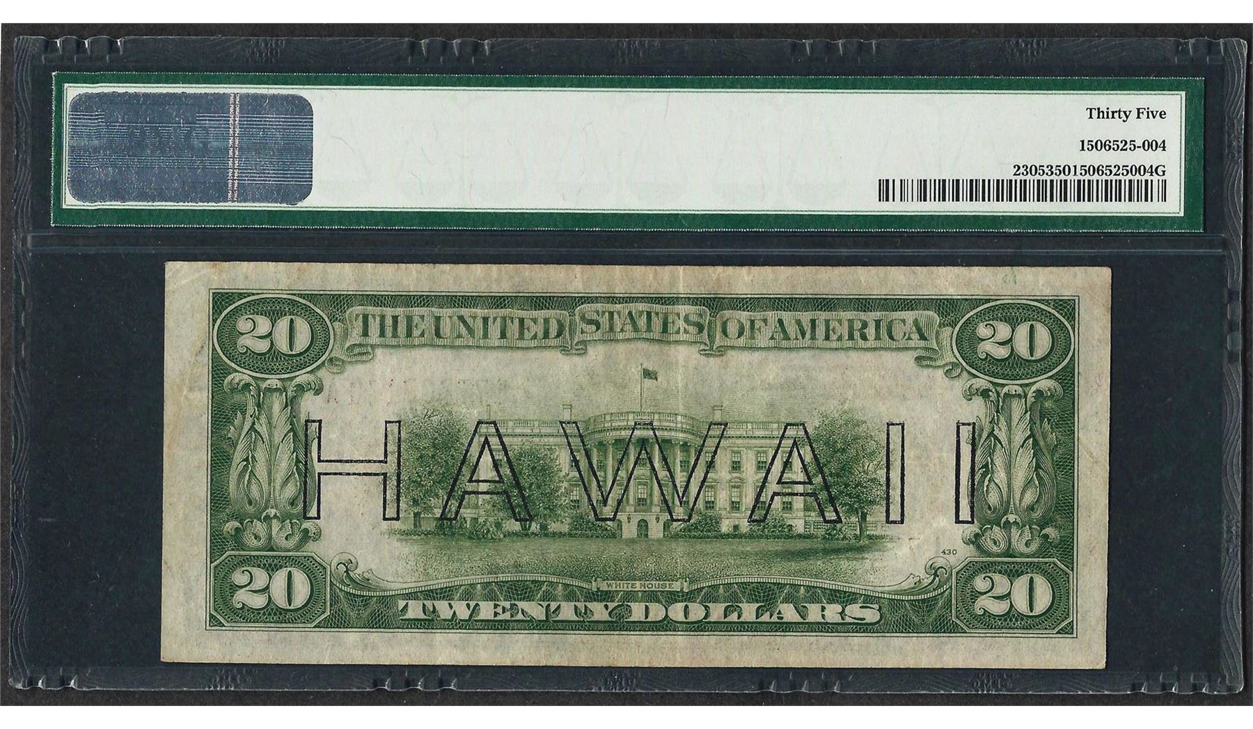 One 1934A $20 Hawaii Federal Reserve WWII Emergency Note Fr.2305 PMG Choice Very Fine 35. PMG Certified.