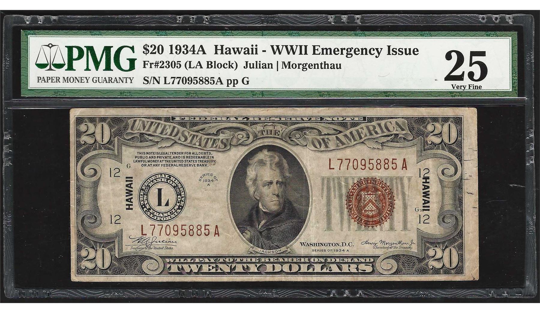 One 1934A $20 Hawaii Federal Reserve WWII Emergency Note PMG Very Fine 25. PMG Certified.