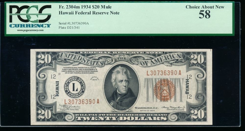 One 1934A $20 Hawaii Mule Federal Reserve Note PCGS 58.