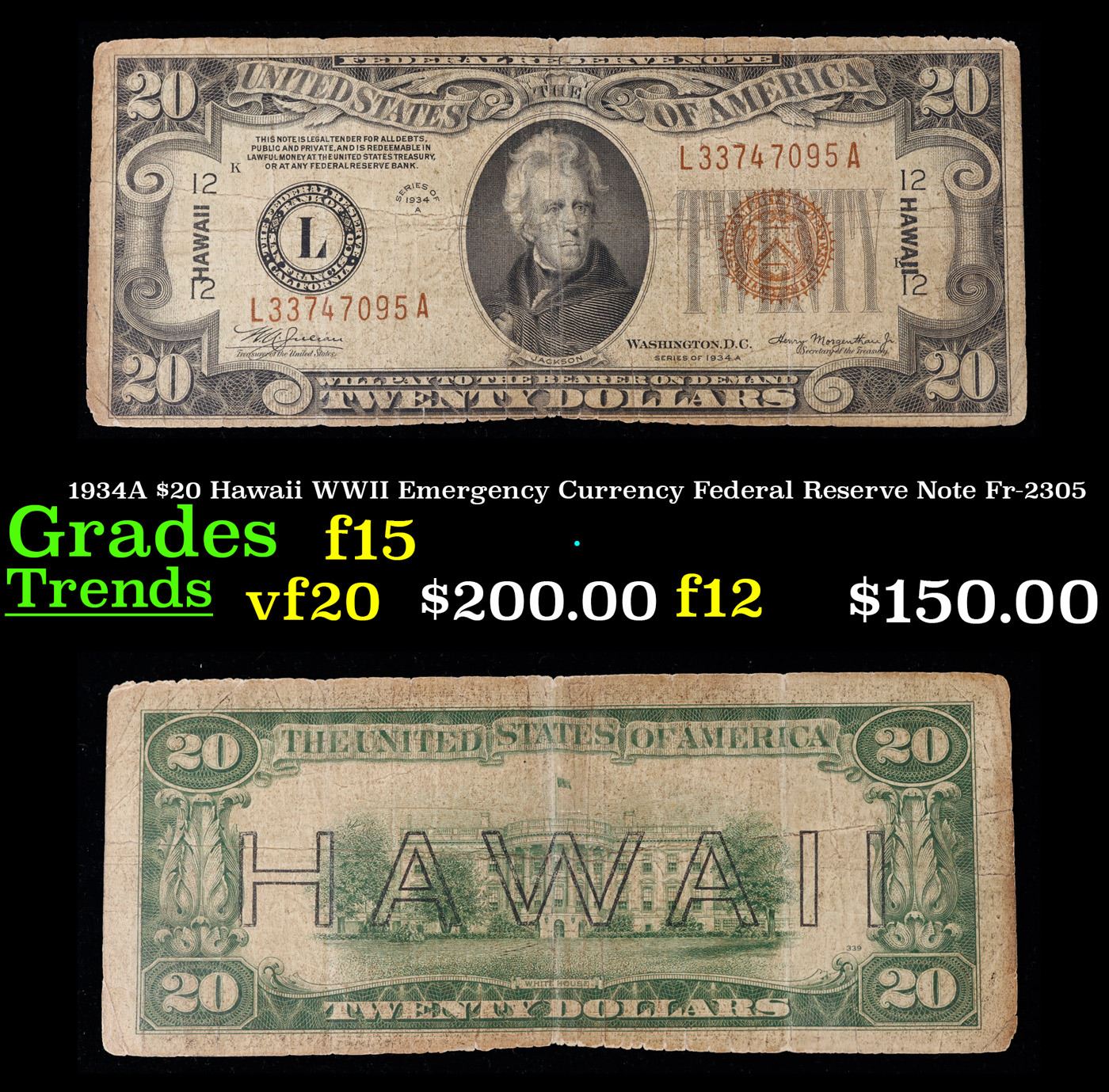 1934A $20 Hawaii WWII Emergency Currency Federal Reserve Note Fr-2305 Grades f+. out of 65 Million Hawaii Notes Printed Only about 16% were $20 Hawaii's. It was the darkest days of World War II, just after Pearl Harbor. Everybody in Hawaii was sitting on pins and needles. Were the Japanese preparing a massive invasion of the islands? If they did invade, they could use the millions of dollars in currency on the islands to buy war material. To thwart this, these $20 Federal Reserve Notes were sent to the islands. Each has a large HAWAII printed on the reverse. If the Japanese did invade, the currency would be demonetized. After the threat passed, most of these "Hawaii" Notes were destroyed. Today they're hard to find.