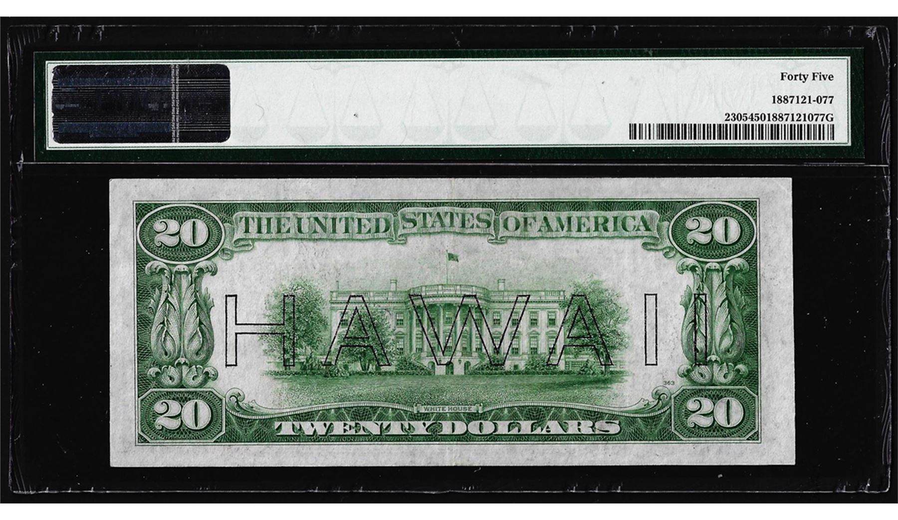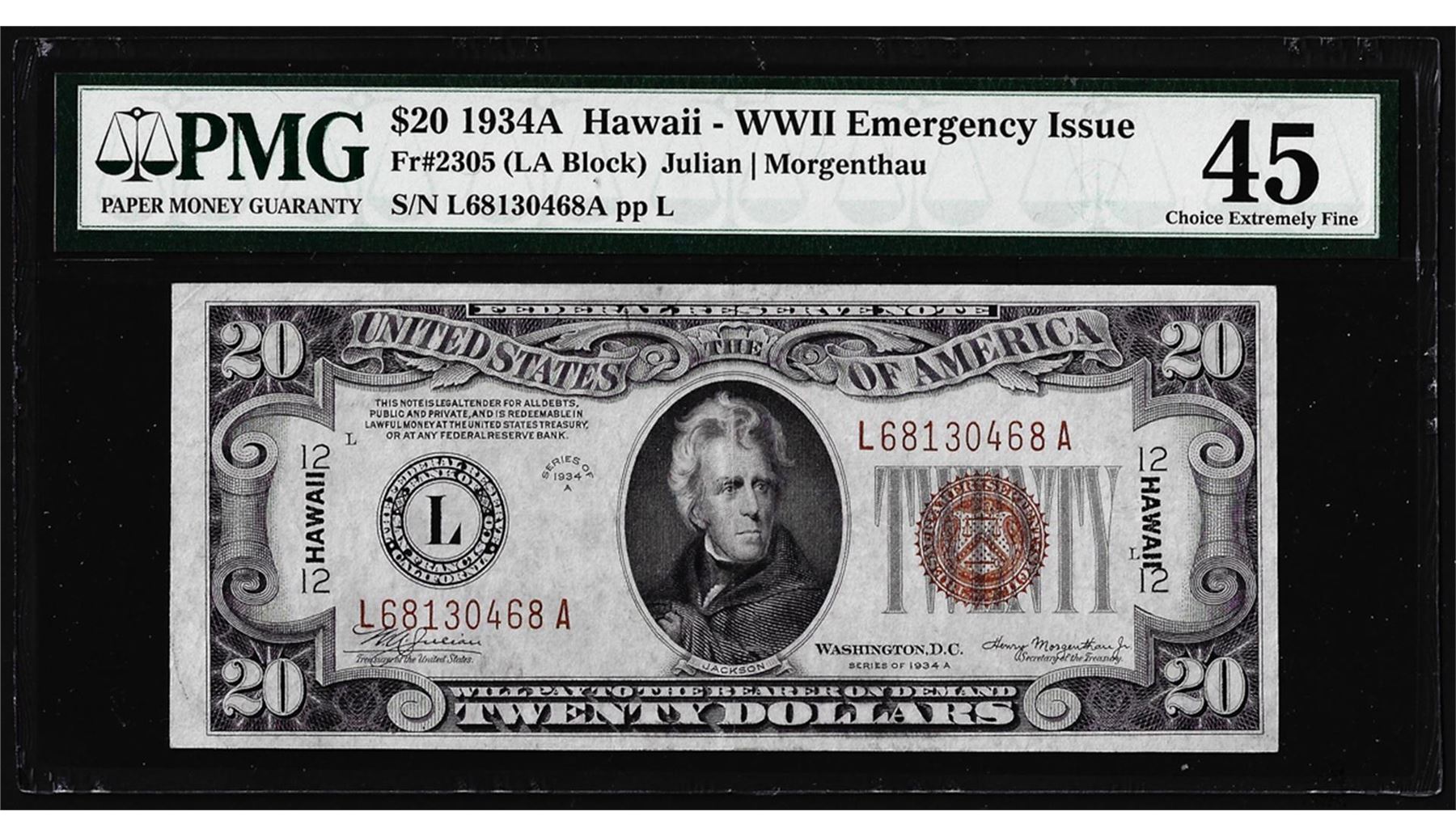 One 1934A $20 Hawaii WWII Emergency Issue Federal Reserve Note PMG Extremely Fine 45. PMG Certified.