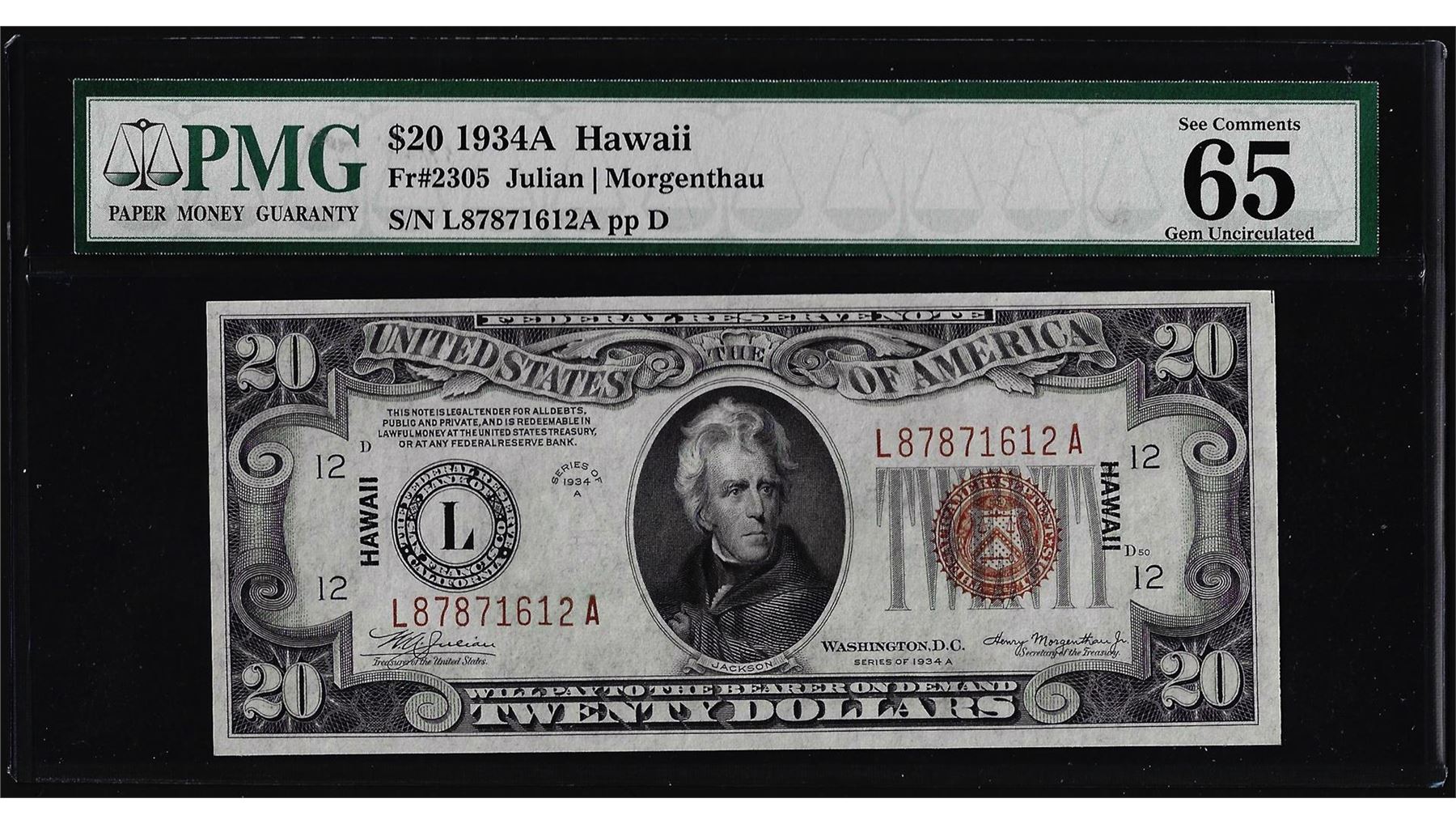 One 1934A $20 Hawaii WWII Emergency Issue Federal Reserve Note PMG Gem Uncirculated 65EPQ. PMG Certified.