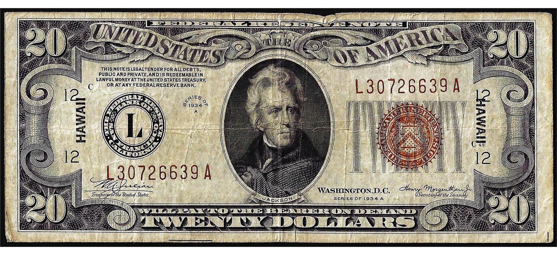 One 1934A $20 Hawaii WWII Emergency Issue Federal Reserve Note.