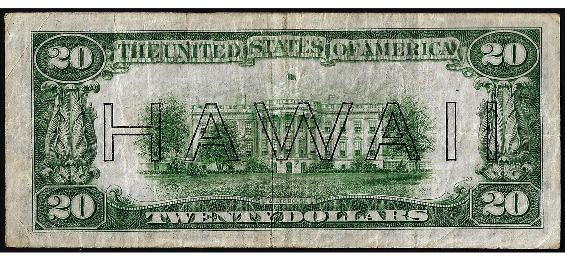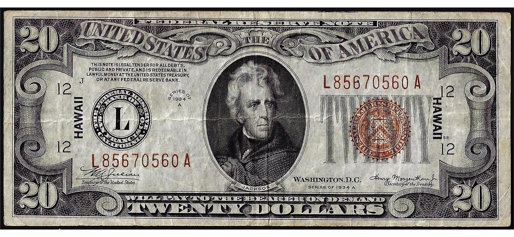 One 1934A $20 Hawaii WWII Emergency Issue Federal Reserve Note.