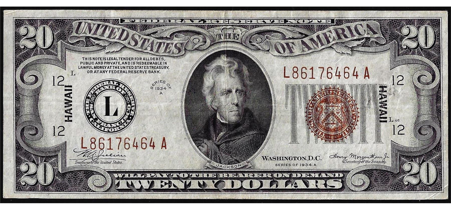 One 1934A $20 Hawaii WWII Emergency Issue Federal Reserve Note.