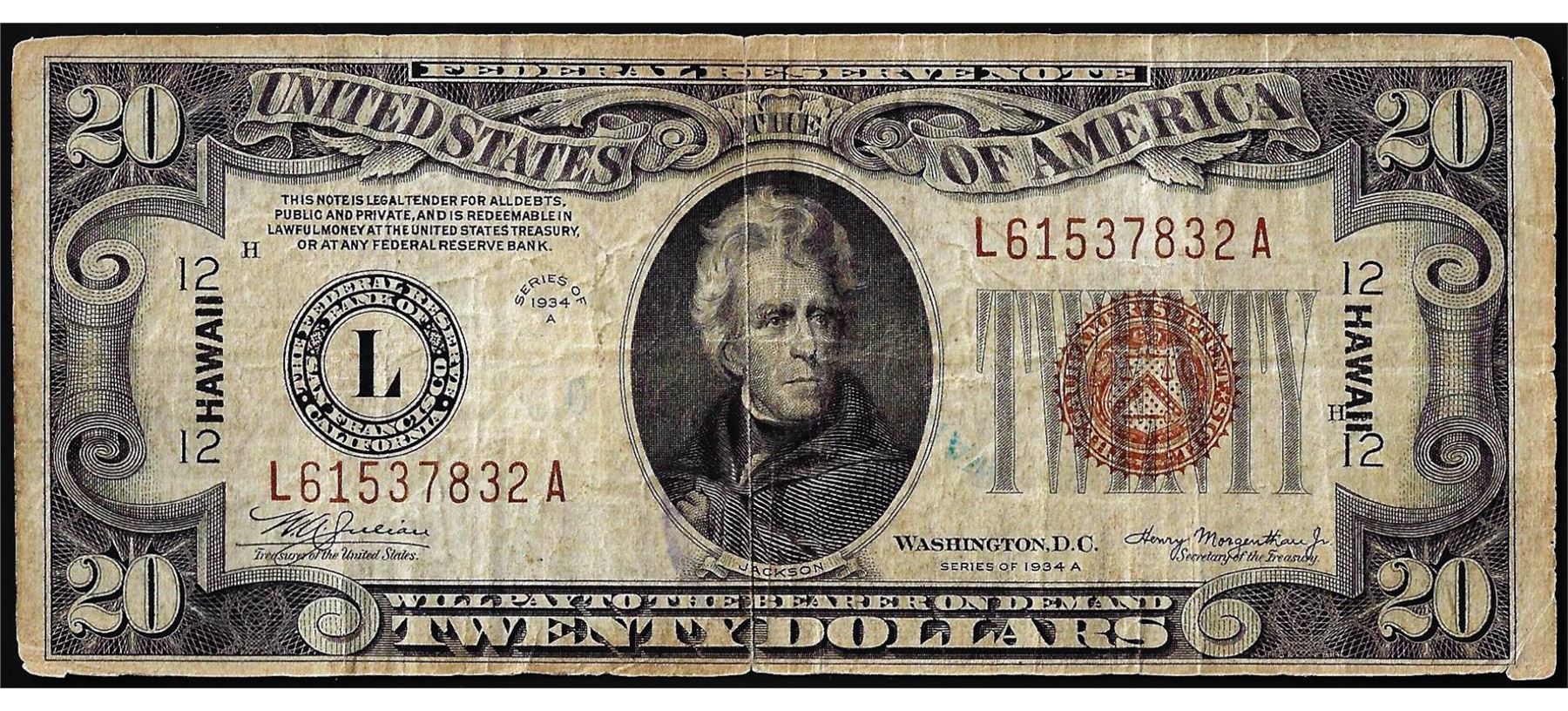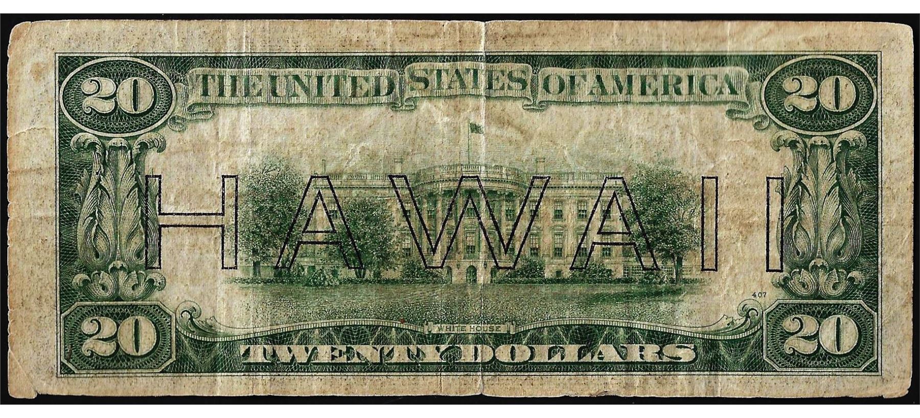 One 1934A $20 Hawaii WWII Emergency Issue Federal Reserve Note.