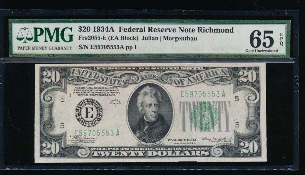 One 1934A $20 Richmond Federal Reserve Note PMG 65EPQ.