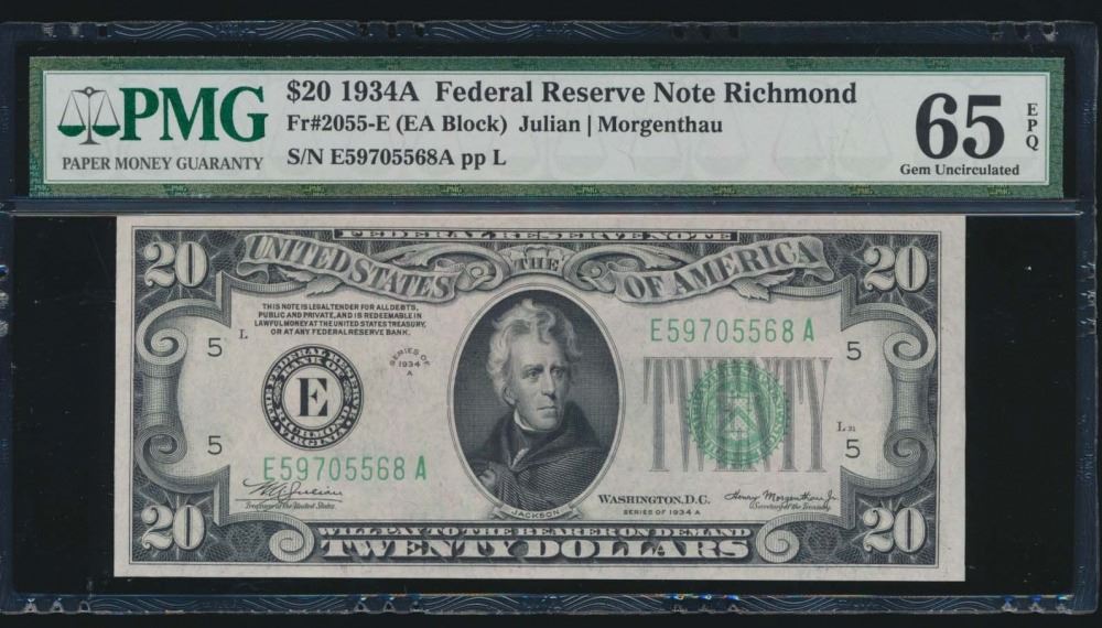 One 1934A $20 Richmond Federal Reserve Note PMG 65EPQ.