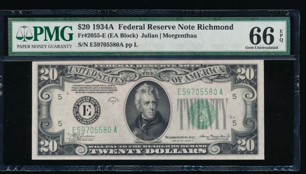 One 1934A $20 Richmond Federal Reserve Note PMG 66EPQ.