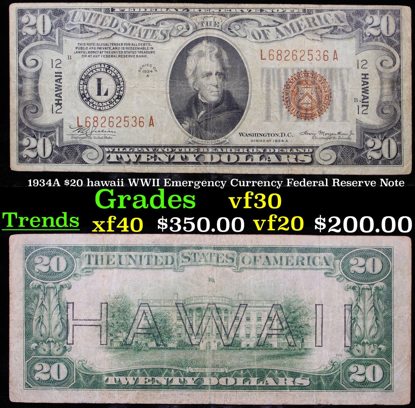 1934A $20 hawaii WWII Emergency Currency Federal Reserve Note Grades vf++.