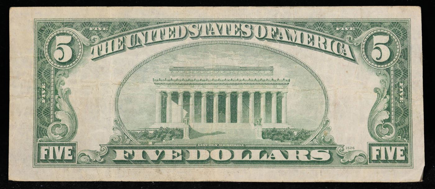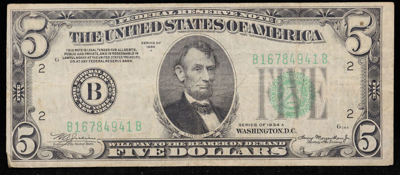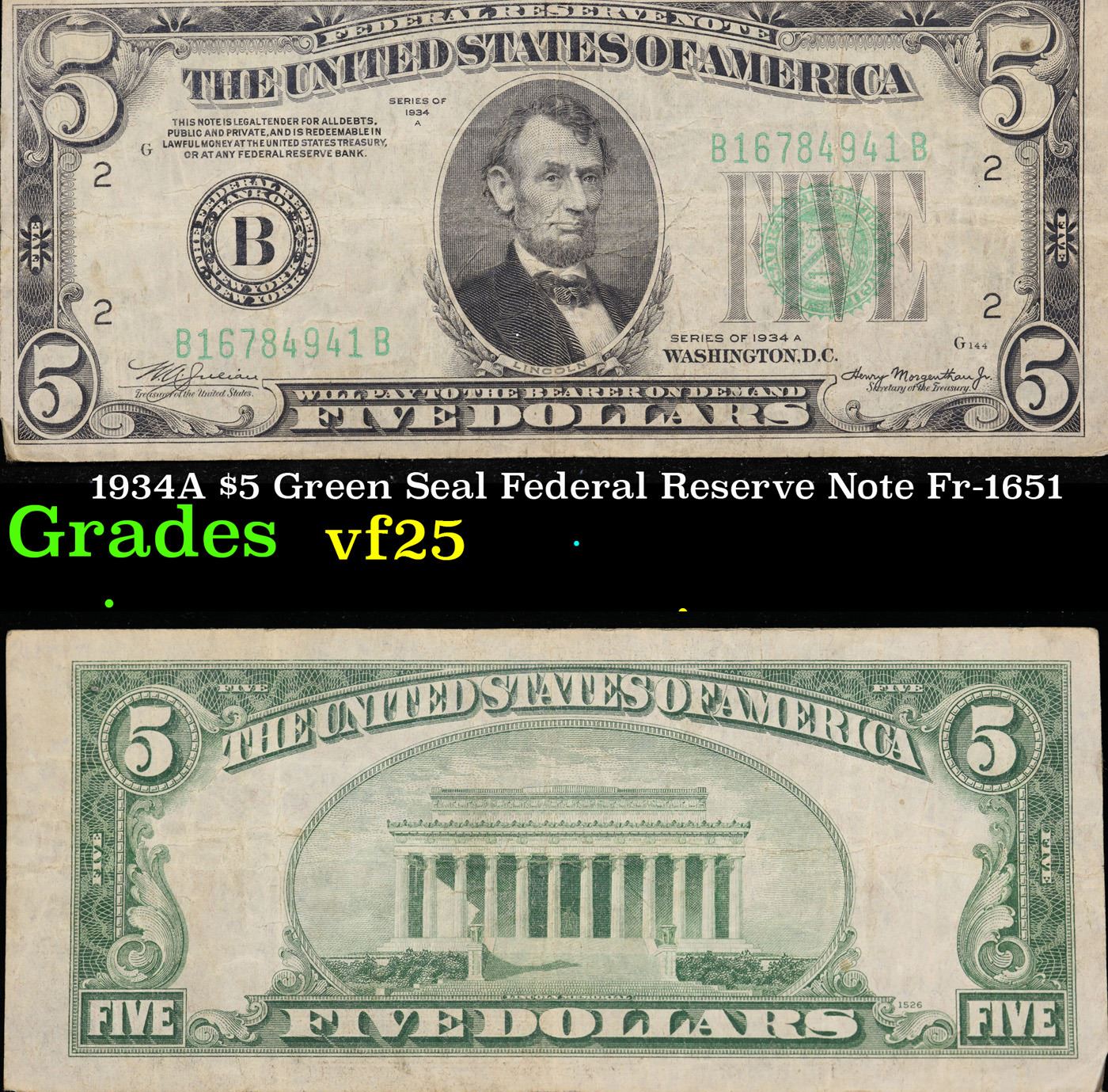 1934A $5 Green Seal Federal Reserve Note Fr-1651 Grades vf+.