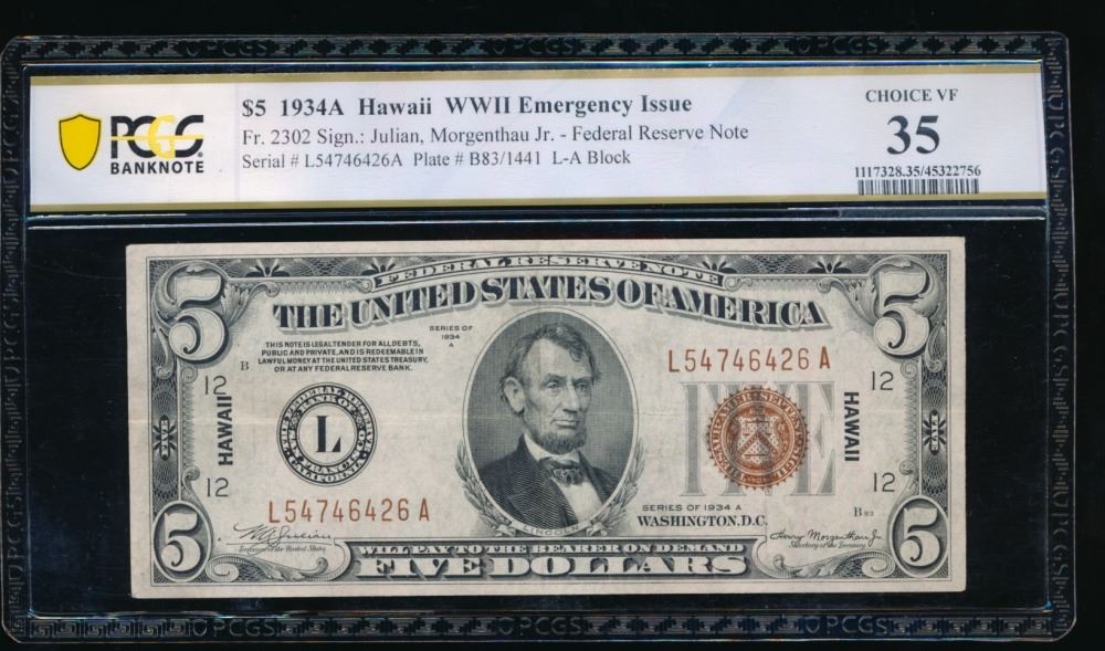One 1934A $5 Hawaii FRN PCGS 35.