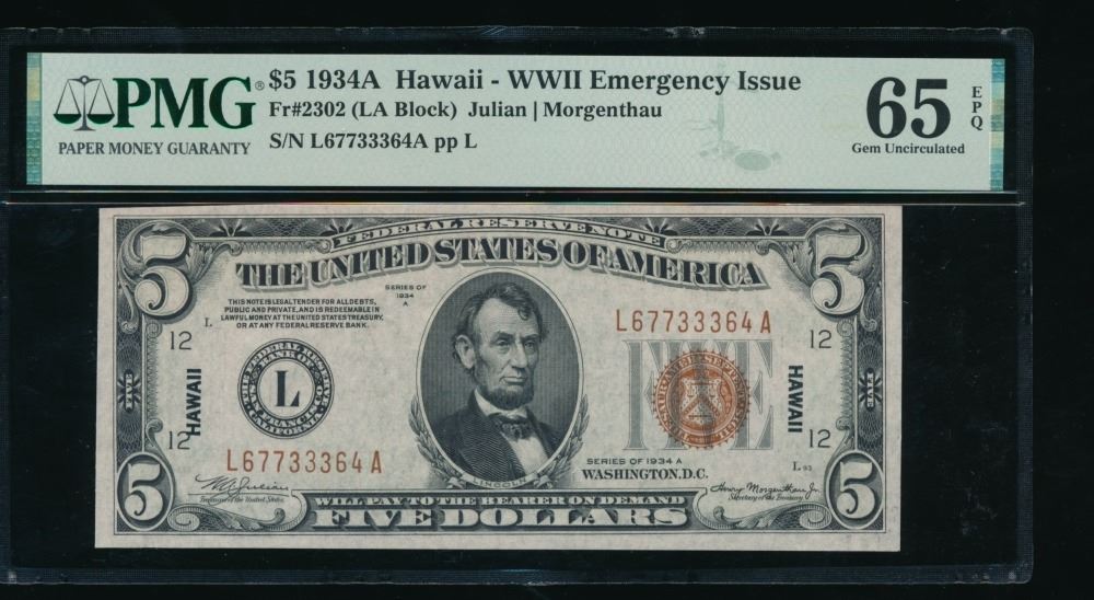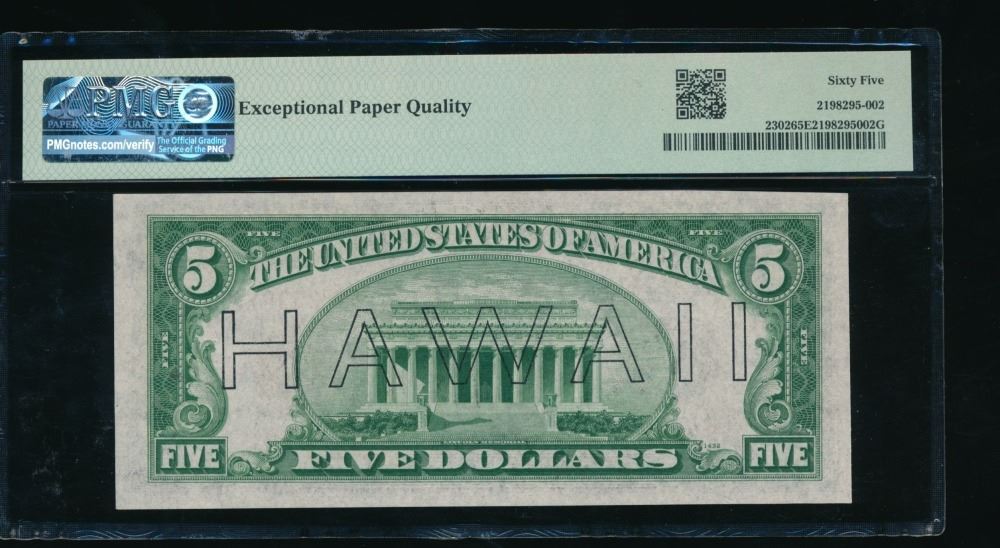 One 1934A $5 Hawaii FRN PMG 65EPQ.