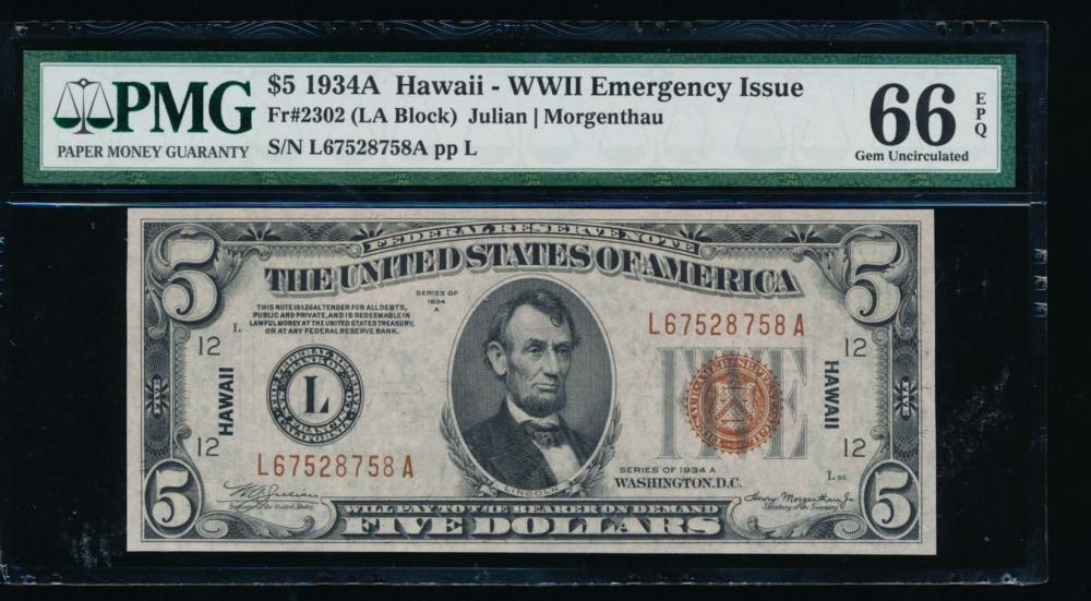 One 1934A $5 Hawaii Federal Reserve Note PMG 66EPQ.