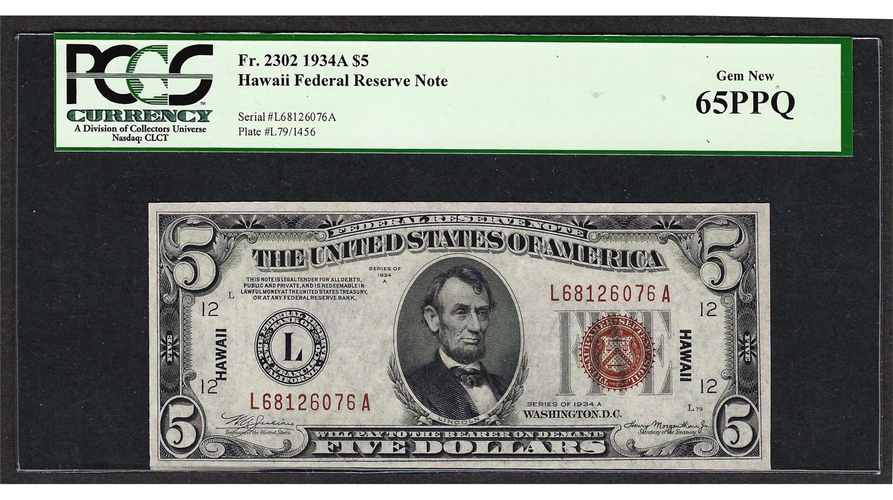 One 1934A $5 Hawaii Federal Reserve WWII Emergency Note Fr.2302 PCGS Gem New 65PPQ. PCGS Graded.