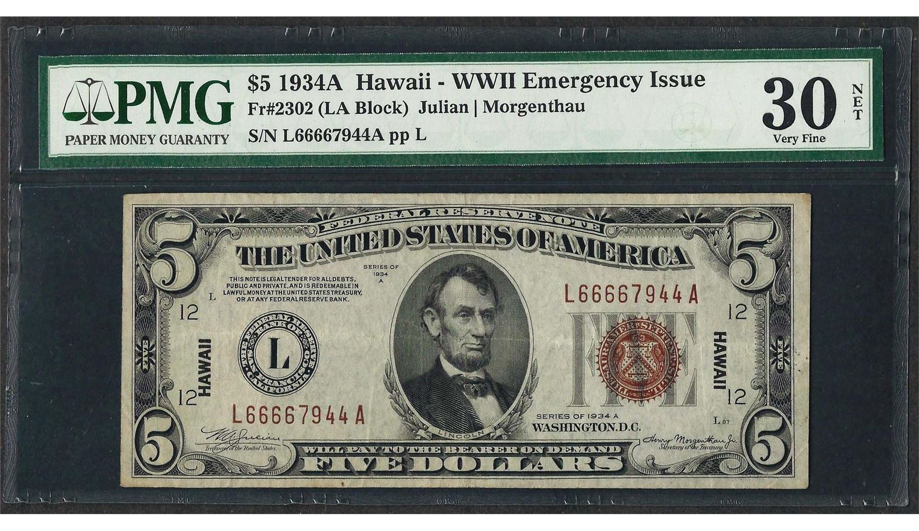 One 1934A $5 Hawaii Federal Reserve WWII Emergency Note Fr.2302 PMG Very Fine 30 Net. PMG Certified.