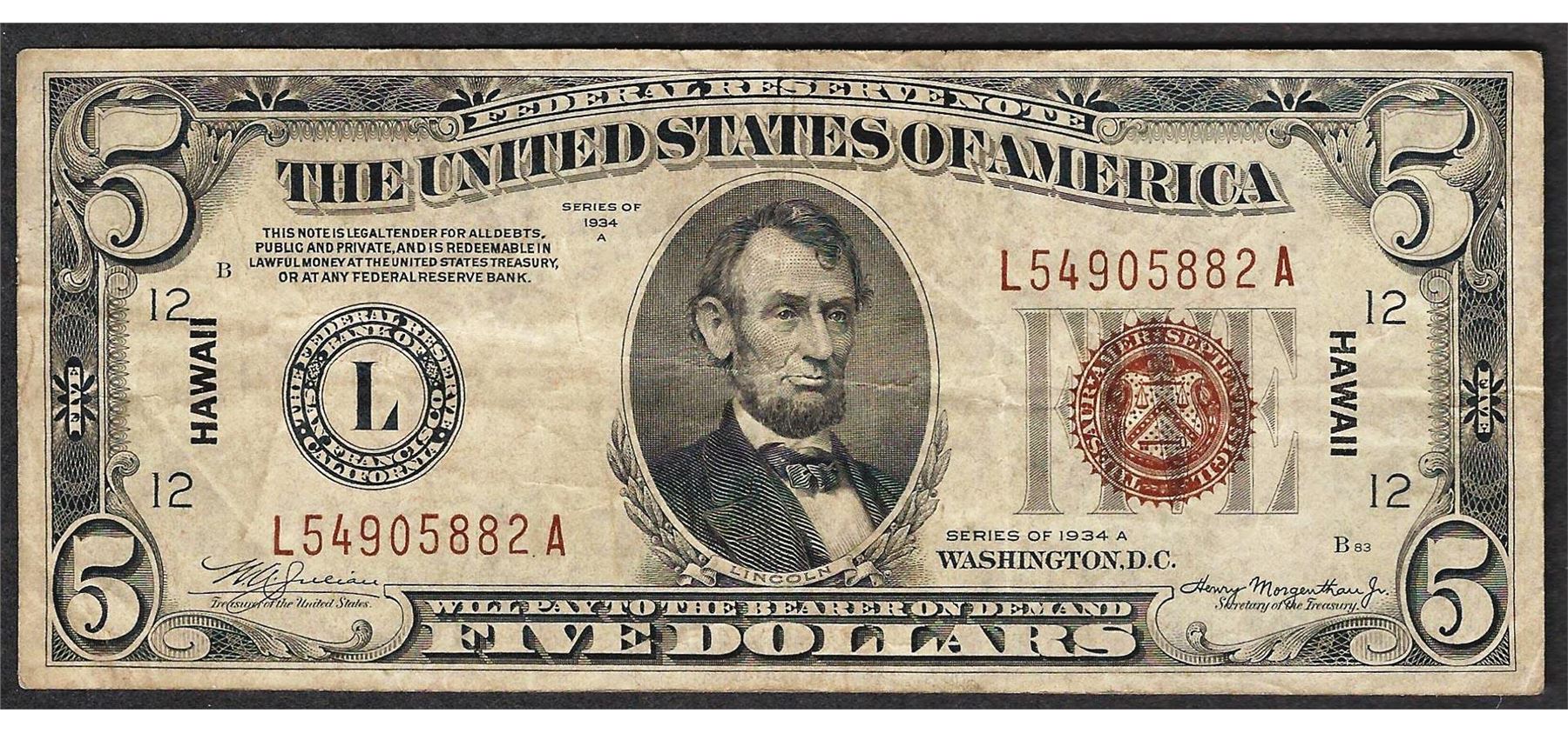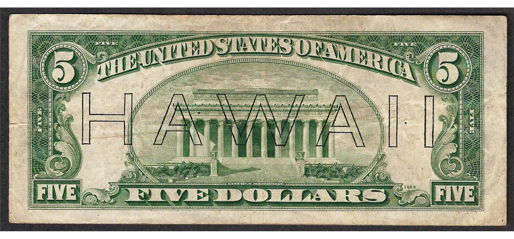 One 1934A $5 Hawaii Federal Reserve WWII Emergency Note.