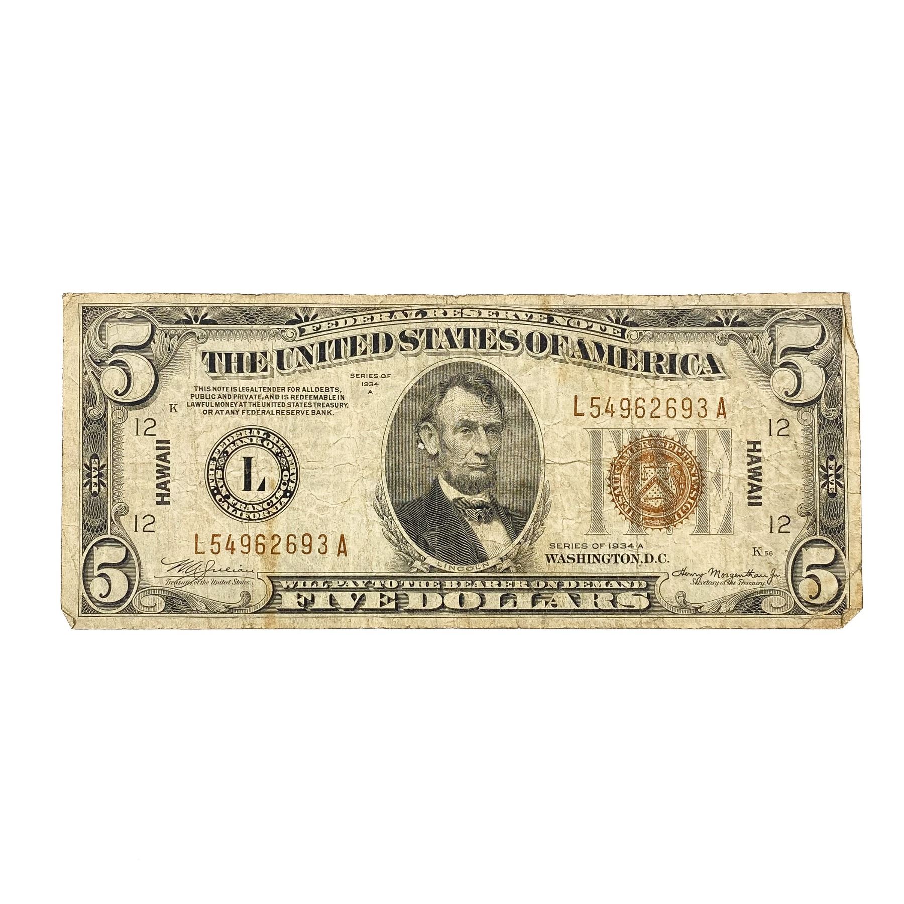 1934A $5 Hawaii WW2 Fed Res Note