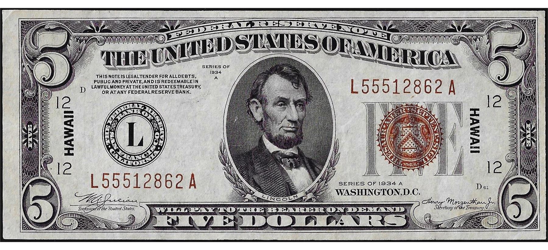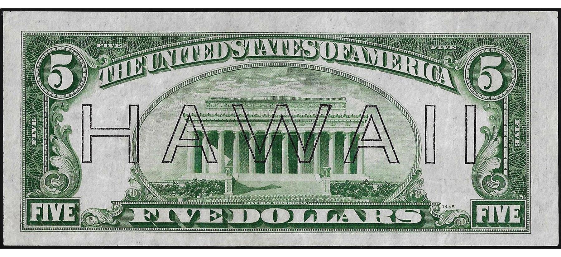 One 1934A $5 Hawaii WWII Emergency Issue Federal Reserve Note.