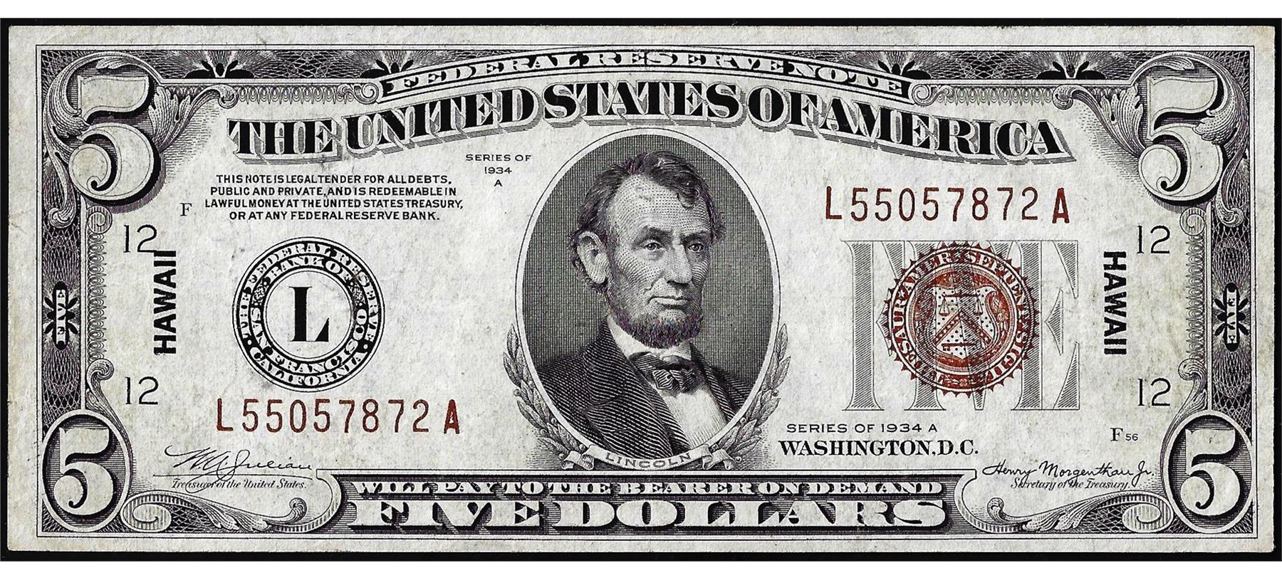One 1934A $5 Hawaii WWII Emergency Issue Federal Reserve Note.